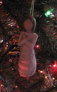 After our first miscarriage in December 2004 we bought a special angel ornament to honor the memory of the baby we had lost. When we found out we were pregnant with Molly and we were deciding how we wanted to share the news with Sean, we decided to get him an ornament that would show him that I had a baby in my tummy. Pictured above is Sean holding the ornament we gave him on the night we told him he was going to be a big brother and to the left is a close up of the ornament hanging on our tree last year.
