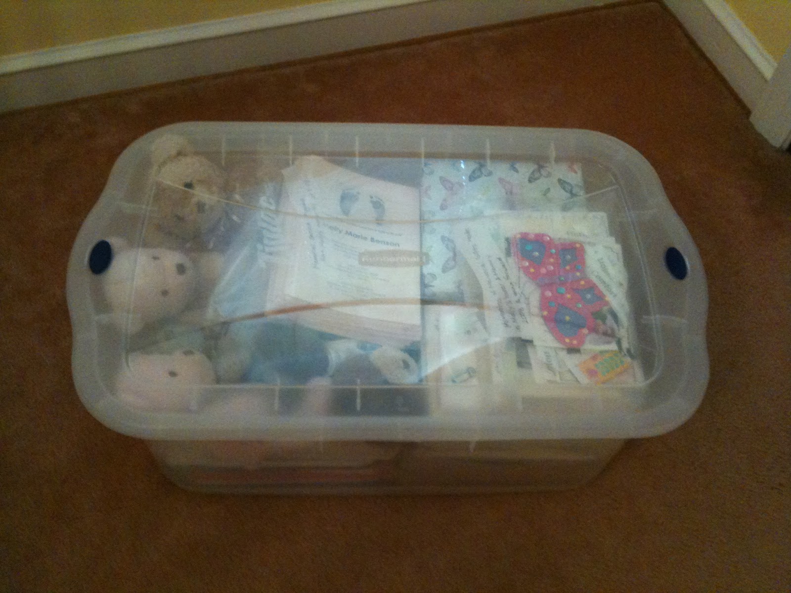 I've been thinking of getting a Rubbermaid tote to put Katie's things into. I have a lot of her stuff (the outfit from the hospital, the cards we got, etc.) in a big hatbox I got at Walmart, but I also have her bedding set & a few other things. I'm thinking they all should be together. I'm sure packing up all those things was very bittersweet for you. (((hugs)))