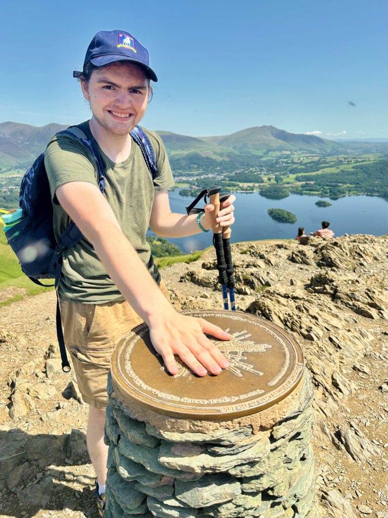 We explored many other wonderful places throughout England, with our last (planned) stop being the Lakes (which TS also sings about). The photo at the beginning of this post captures you at the top of Catbells in the Lake District, near where we stayed in Keswick. Your hand is on a “Wainwright” trig point, which marks the summit of the Catbells fell (mountain) that we climbed. It was another peak life experience (as my mom/your Grandma Jacquie referred to them), both literally and figuratively. Also, as you may recall, 22 was Grandma Jacquie’s lucky number (since she was born on September 22nd). If you look closely at the photo, you may notice some fuzzy spots and recall that there were lots of small gnat-like bugs (probably midges, which we later learned of) at the top of Catbells, which were everywhere and pretty gross (we had to mostly keep our mouths closed so they wouldn’t fly in). They were even swarming the trig point! Thus, sadly, we didn’t get/choose to stay there long before we headed back down.