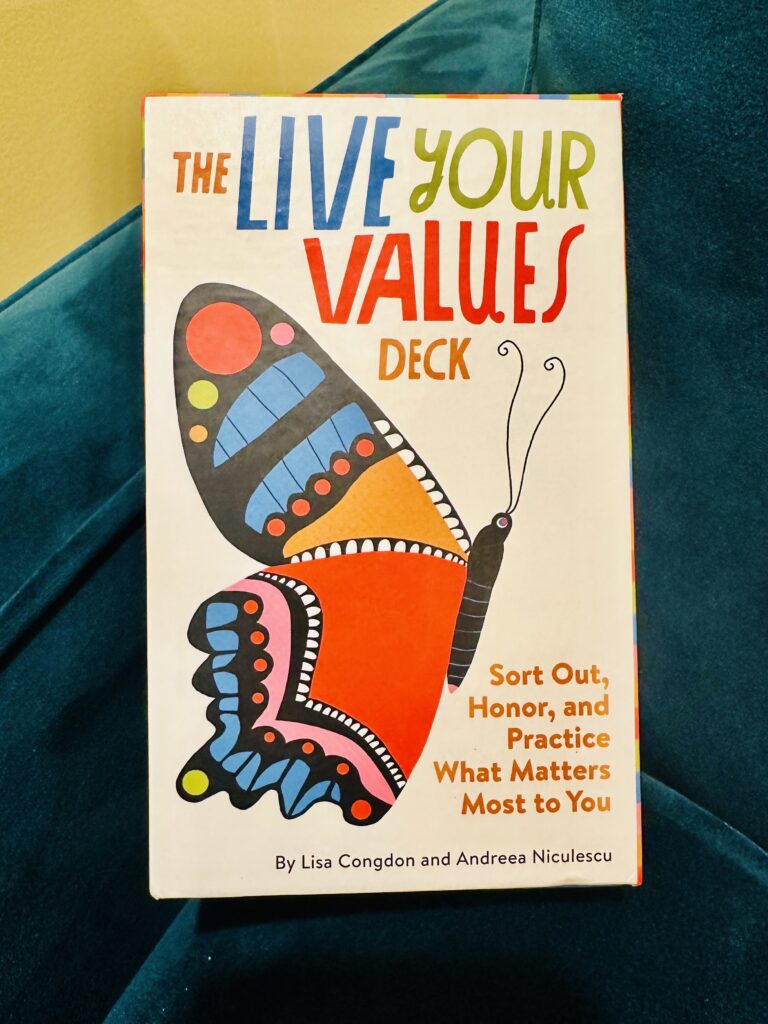 Another thing we talk a lot about is living our values and making choices in line with them. Especially in these times, keeping our core values in mind when faced with difficult and uncertain circumstances can be so helpful. Though we were familiar with values exercises, one of the awesome therapists in our life introduced us to the beautiful “The Live Your Values Deck” by Lisa Congdon and Andrea Niculescu, which can be used to “sort out, honor and practice what matters most to you,” and we liked it so much that I ordered a set for each member of our family.